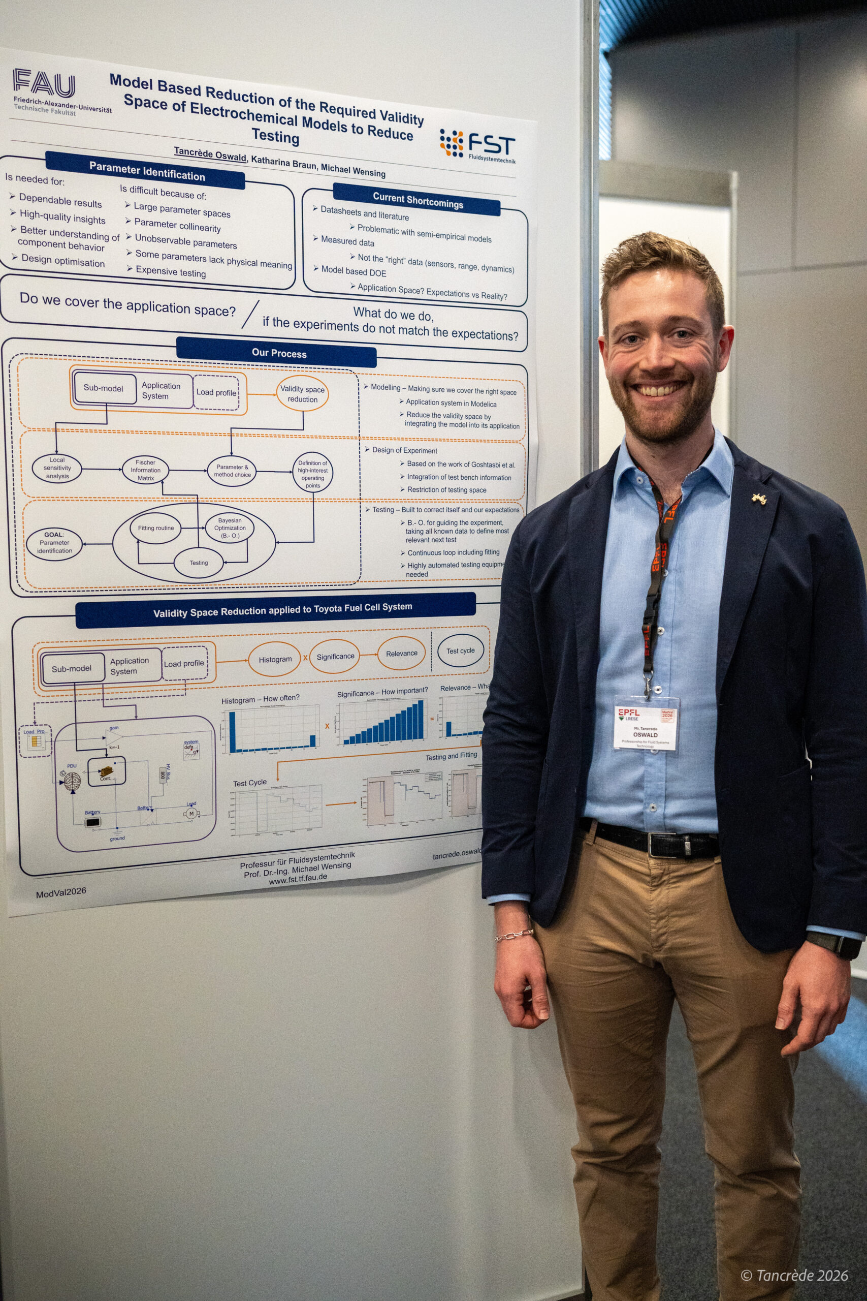 Anfang März vertraten Kira Ohlinger und Tancrède Oswald die Professur auf der ModVal in Lausanne. Frau Ohlinger zeigte auf ihrem Poster Innovationen im Bereich elektrochemischer LOHC-Anwendungen. Hier wurde gezeigt, wie Energieüberschüsse aus erneuerbaren Energien aus den Sommermonaten für die Wintermonate zur Verfügung gestellt werden können. Herr Oswald zeigte auf einem Poster und in einem Vortrag, wie mithilfe modellbasierter Messmethoden die Parameteridentifikation elektrochemischer Komponenten effizienter gestaltet werden kann. Auf der ModVal fand ein reger Austausch zu den neuesten Fortschritten im Bereich der Modellierung elektrochemischer Systeme statt. Diese boten gute Anknüpfungspunkte zur Systemapplikation und zu den Messmethode, wo auch die Schwerpunkte der Professur liegen.